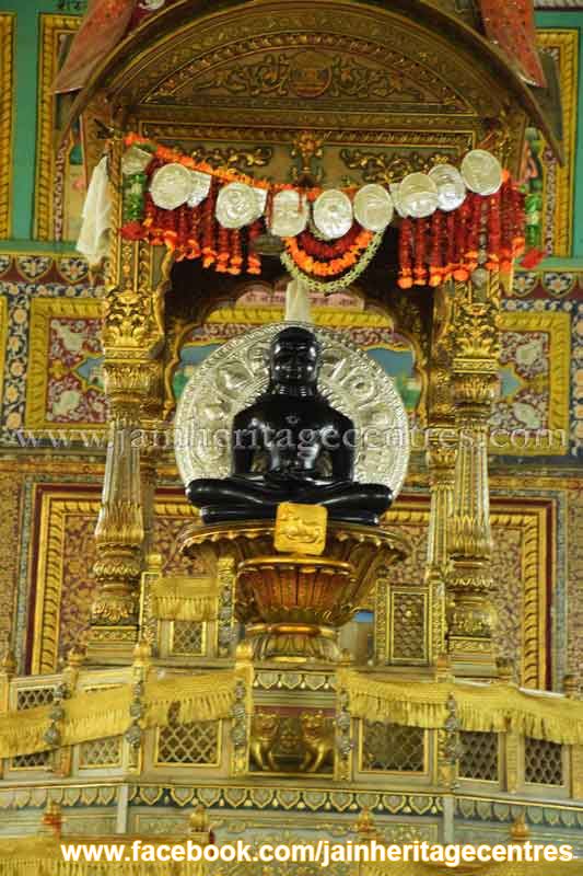 - Main deity – About 2 feet high black coloured stone idol of Lord Adinath in padmasana posture inside a mantapa on a attractively carved platform.